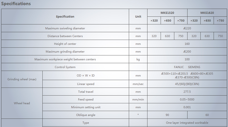 As medium-size CNC cylindrical grinding machines, MKS1320 and MKS1620 CNC (endface) cylindrical grinding machines are independently developed and manufactured through the Company with the characteristics of high rigidity, high efficiency and high adaptability. Being the productive CNC cylindrical grinding machines of easy-to-operate, reliable performance and high processing precision, these machine tools are suitable for the usage in mass productions for industries including automobile, motorbikes, air compressors, bearings and also small-scale high precision productions in workshops of military industries, aviation industry, aerospace industry and common precision machining.