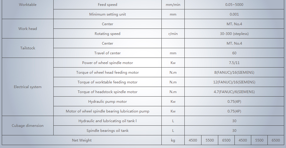 The machine tool adopts an imported advanced CNC system and is provided with all-around controlling functions including grinding program changes, work-piece quality control, machine condition monitoring, fault self-diagnostics, abnormal alarm, and convenient menu type interface input.